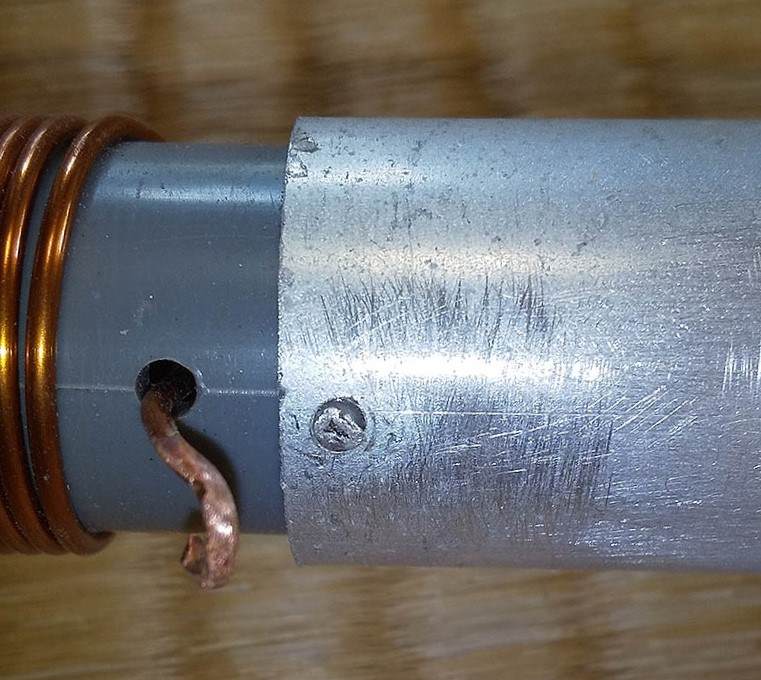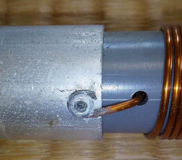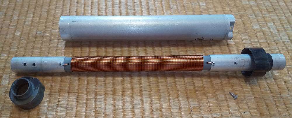 太いパイプの中にコイルを固定します。タイトのコイルボビンに取り付けネジがついていますので、そのまま応用できます。手前につきだしているビスは、エレメント接続用。