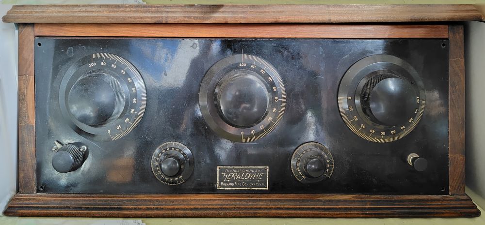 「国産第一号鉱石ラジオ」の頃のもので、アメリカIowa州にあった(らしい)Brenard Mfg.という会社製の "Heraldyne Radio" という真空管ラジオです。
