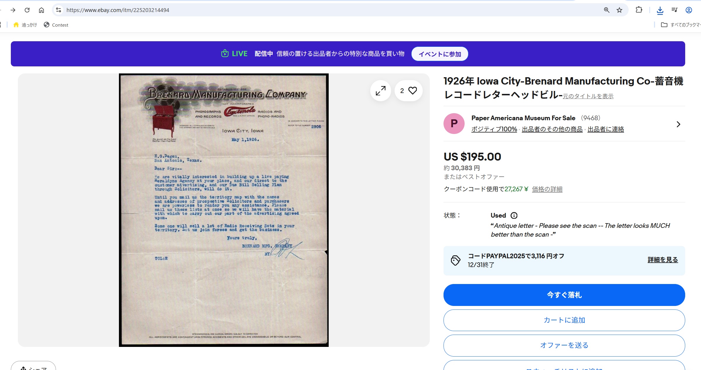 当時のletterが出品されていました。