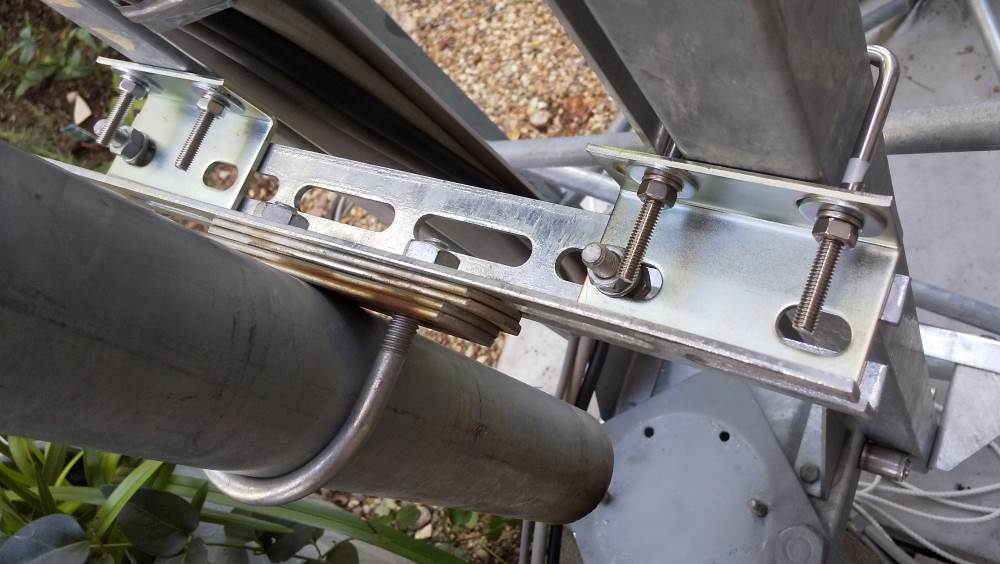 ローテーターは、マストベアリングとともにマストを支えるカナメになっているので、ローテーターをはずすとマストが傾いてしまいます。これでは困るので、ローテーターの代わりにマストを支える工夫が必要です。簡単には、マストを針金でエレベータのレールに結わえればよかろうと思いましたが、今後のことも考え、金具を準備することにしました。